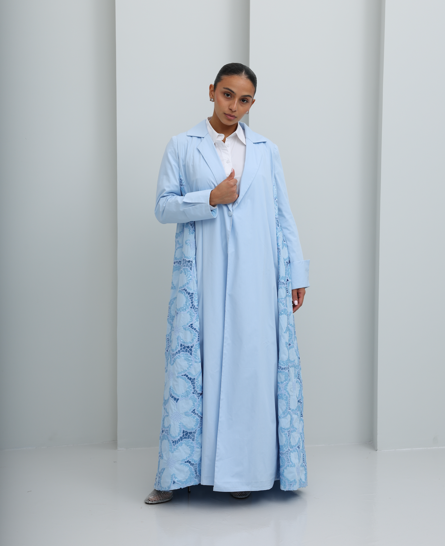 Graceful blue abaya adorned with delicate floral motifs. Subtle sequin detailing adds a soft shimmer with every movement. Flowing silhouette that blends elegance with understated charm